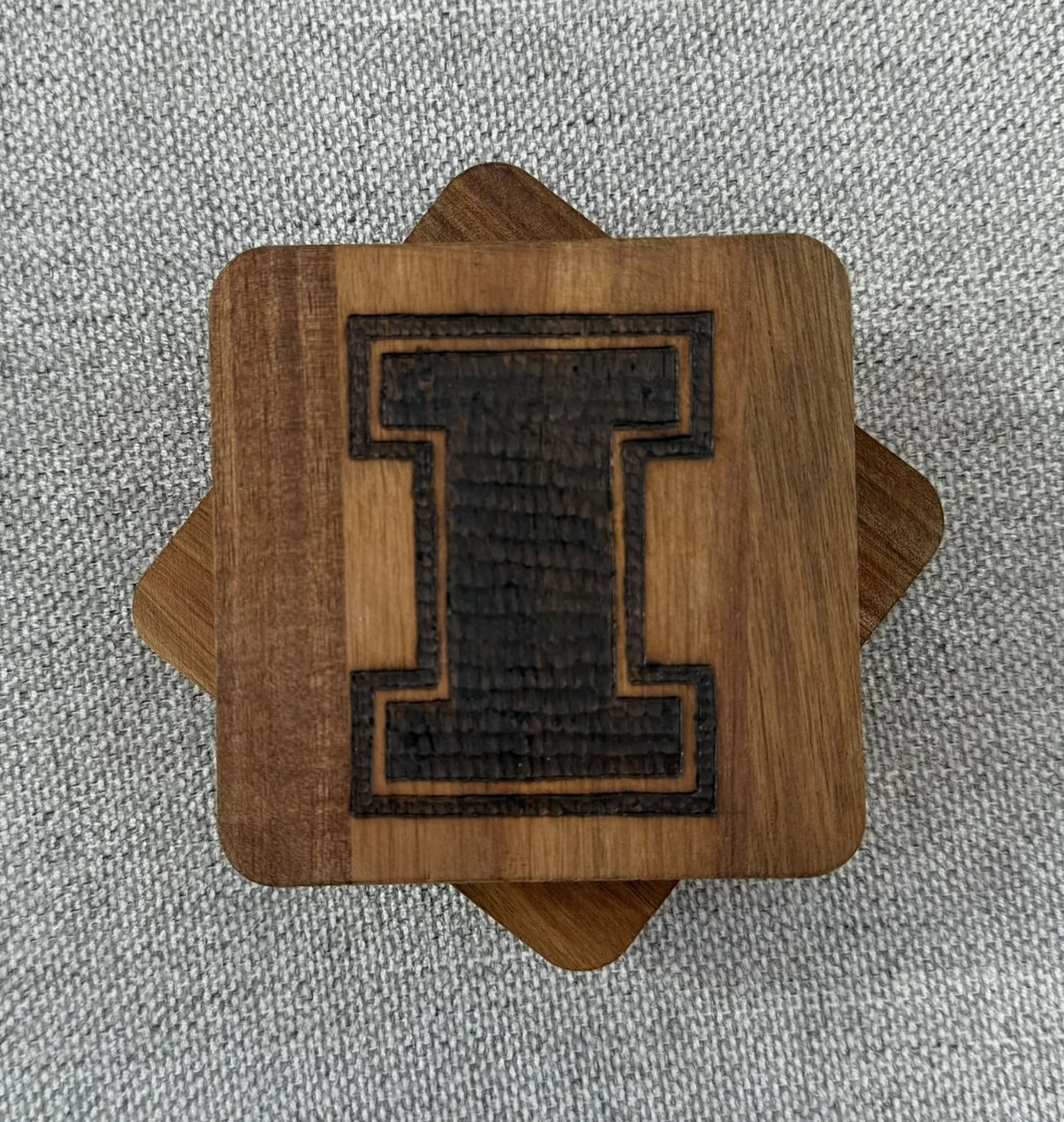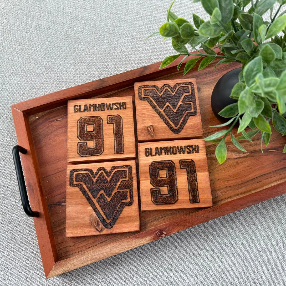 These handcrafted wood coasters celebrate school pride and a love for the game. Featuring the college logo and a custom “back of the jersey” with his last name and hockey number, they’re a sweet keepsake that brings the energy of the rink—and the hive—home.
